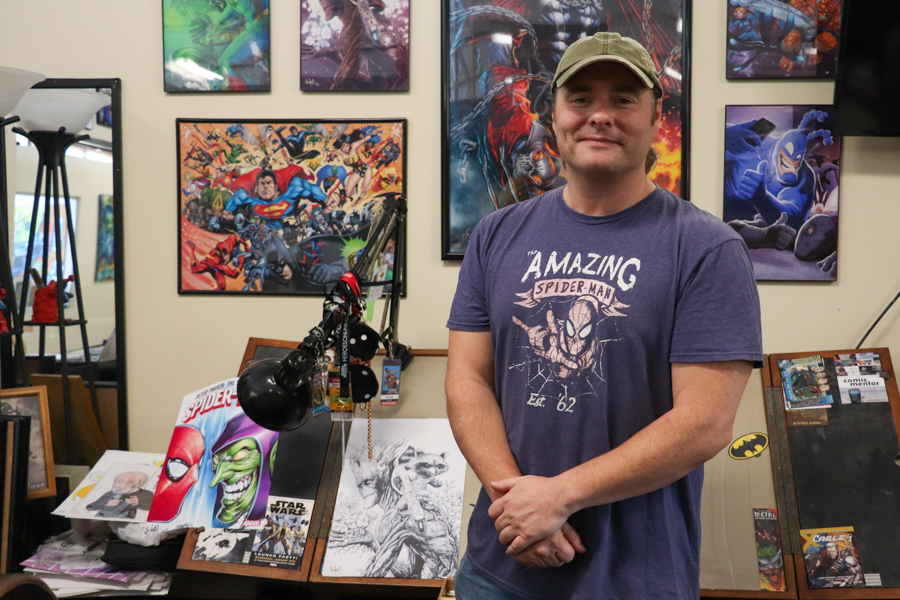 Kevin Stokes, in Studio 313 at Lowe Mill ARTS & Entertainment, has been an illustrator throughout the years for various comic companies, gaming companies, and independent projects . The opportunity to work with Marvel’s Stan Lee on the NHL’s ‘The Guardian Project’ is one of his favorite collaborations; as well as working for DC Comics on Deadman. He has also trained as a caricature artist at Six Flags in Georgia and is currently working on his own comic creations titled: Departure, Splitsville, Immortex, and Hidden Worlds.