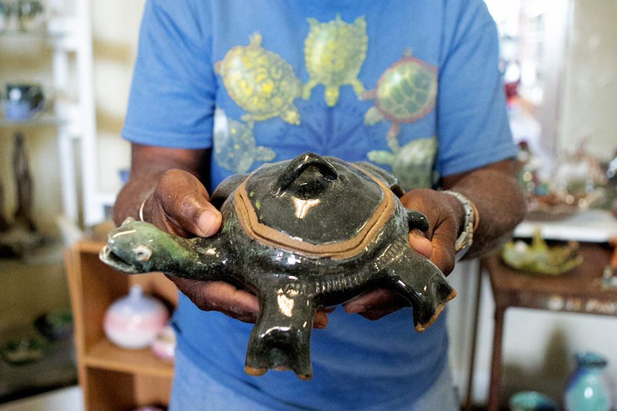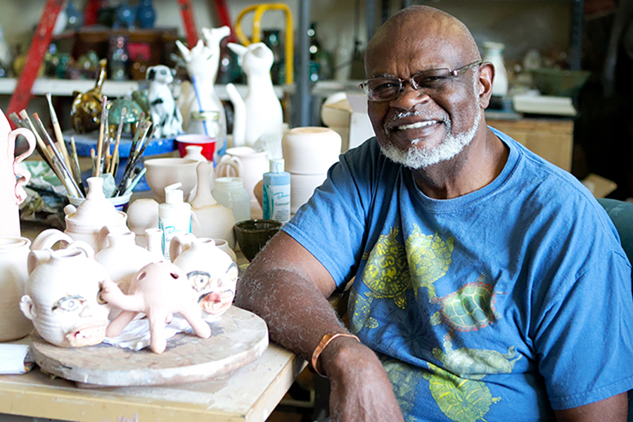 Calvin Hubbard, a native Texan, infuses his pottery with a distinct Southwestern influence. His earthy-toned ceramic pots and sculptures radiate warmth—not just inviting, but blazing with intensity. While his textures and colors evoke the resilience of a sun-scorched landscape, his subject matter bursts with life. His work features wild animals, significant historical figures, and powerful symbols of family and faith, seamlessly blending artistry with storytelling. Each piece reflects his deep appreciation for nature, history, and culture. Calvin and his lovely wife, Evelyn, will be happy to sign you up for their next ceramics class!