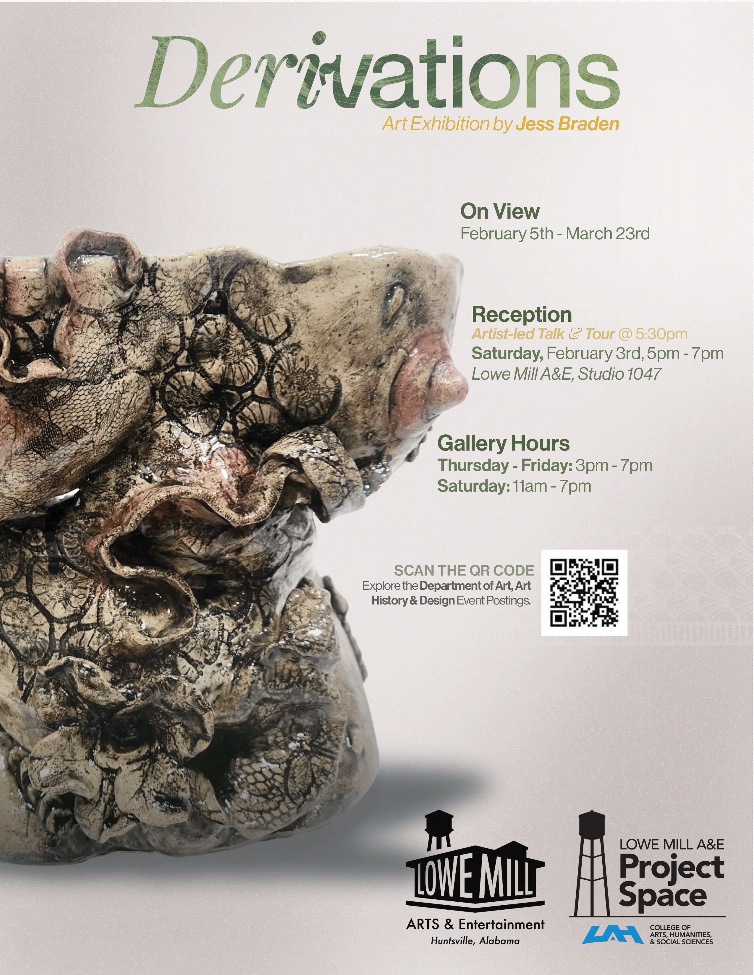 North Floor Gallery 2211 Seminole Drive, Huntsville, AL, United StatesThis exhibition round includes works provided by Dezzy Moon which will be on view in the North Floor Gallery from February 7 - March 30, 2024. Lowe Mill A&E invites patrons and art lovers to join us for Open Studio Night, a building-wide experience when our over 150 studios will be open to the public. …